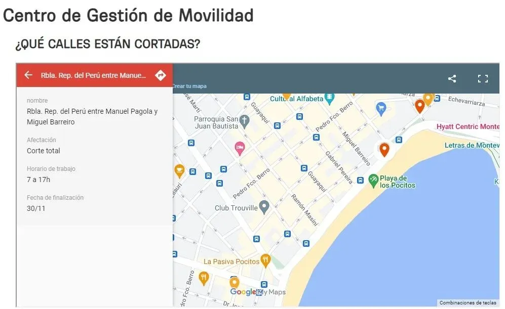 En la página web del Centro de Gestión de Movilidad (CGM) la Intendencia advierte que en la cuadra de la rambla República del Perú entre Manuel Pagola y Miguel Barreiro hay un "corte total" que se extenderá desde las 7:00 hasta las 17:00 de este miércoles.