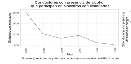 Por otro lado, la ley ayudó a que descendieran los accidentes con conductores alcoholizados, según ilustra esta gráfica que toma como factores los siniestros con lesionados y el porcentaje de conductores con presencia de alcohol en sangre. La información fue extraída de informes de siniestralidad que realizó la Unidad Nacional de Seguridad Vial (Unasev) sobre el periodo 2014-2019.