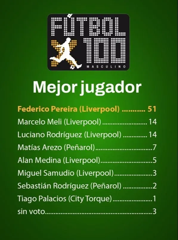 Federico Pereira fue elegido como el mejor jugador del Campeonato Uruguayo 2023 en la tradicional encuesta Fútbolx100 que organiza anualmente El Observador para premiar a los mejores de la temporada en el fútbol local.