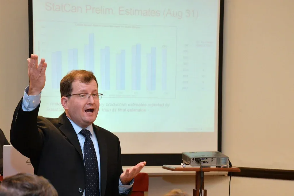 Seth Meyer, durante su reciente exposición en la Cámara Mercantil de Productos del País Seth Meyer, presidente del Consejo Mundial de Perspectivas Agrícolas (World Agricultura Board del USDA), visitó Uruguay la semana pasada y dio su punto de vista sobre estos temas. Sobre la fuerte expansión del maíz y la soja, destacó en diálogo con El Observador el impacto que esto ha tenido también sobre la superficie del trigo. Lo que tendemos a observar es que las decisiones se toman en torno a las relaciones de precios, y de acuerdo a esas relaciones el trigo es atractivo. Los precios del trigo subieron significativamente, los de maíz un poco relativamente a la soja y la soja es la que ha perdido, dijo.