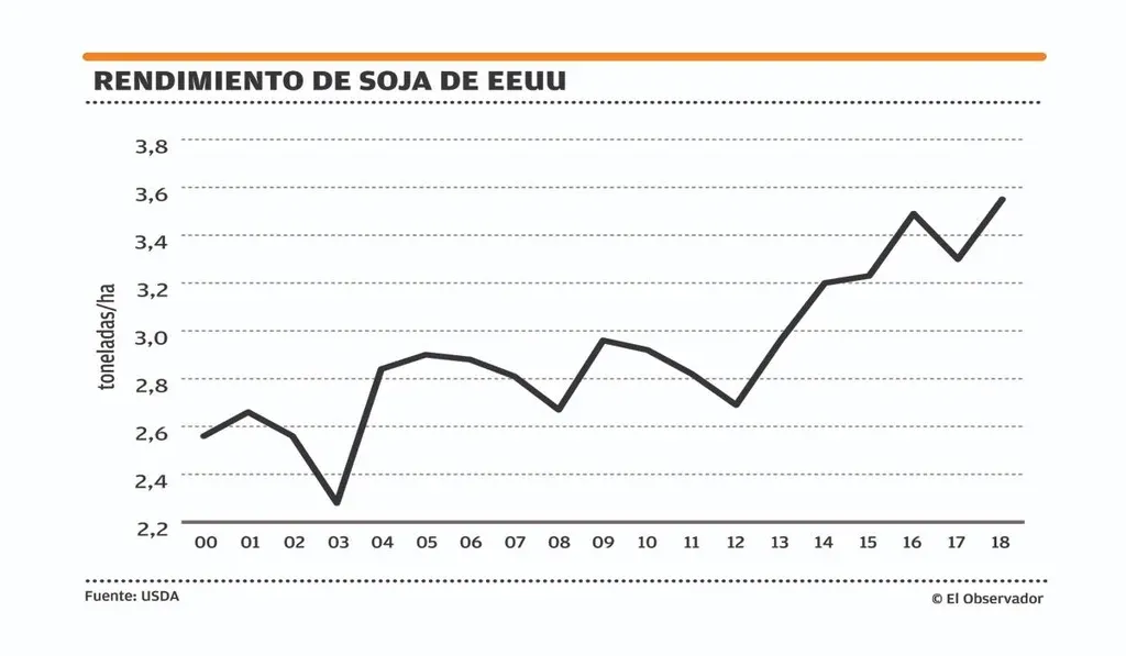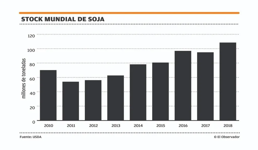 El Departamento de Agricultura de Estados Unidos (USDA) proyecta una cosecha de 128 millones de toneladas. Que se exporten 56 millones, que se procesen internamente 56 millones y se guarden en stock 16 millones adicionales llevará las reservas a niveles nunca antes alcanzados. Pero, ¿cómo colocar 56 millones de toneladas si China no compra? Si las exportaciones son menores, las reservas de soja se incrementarán todavía más.