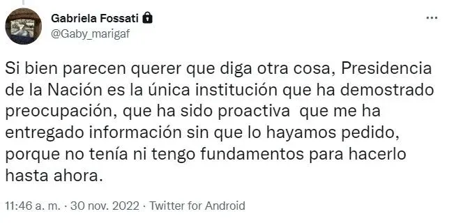 Previamente, antes de escribir esas líneas, Fossati hizo un pedido: "Por última vez, les pido a los señores periodistas que dejen de llamarme. Hace dos meses que me persiguen, a cualquier hora del día, afectado mis derechos, también desde mi institución, afectando mi intimidad y poniendo en riesgo a mi familia".