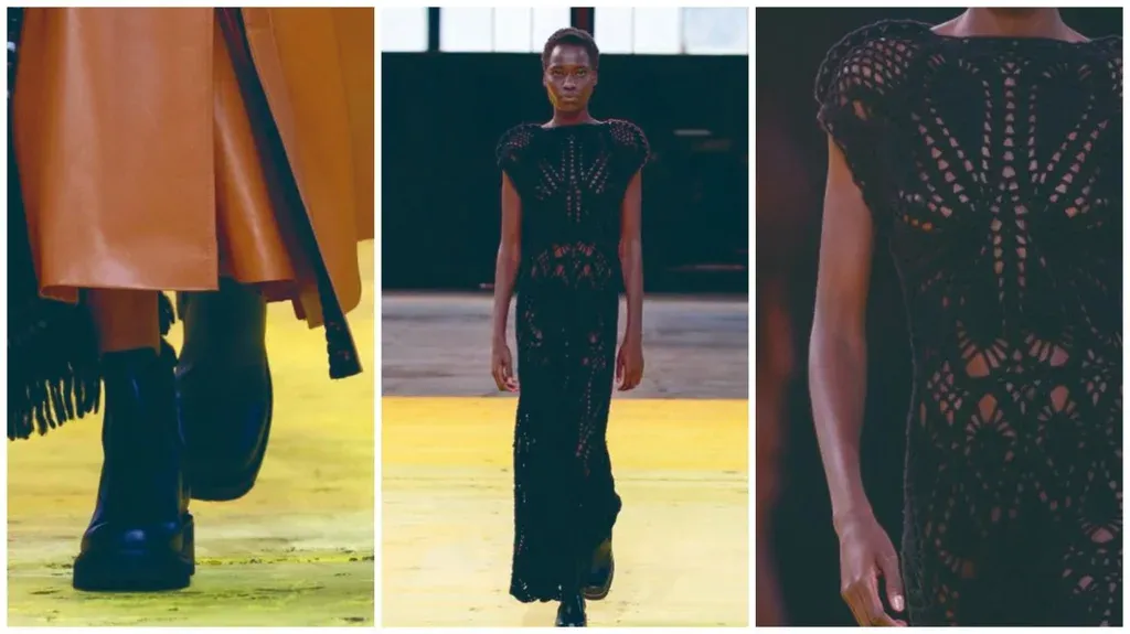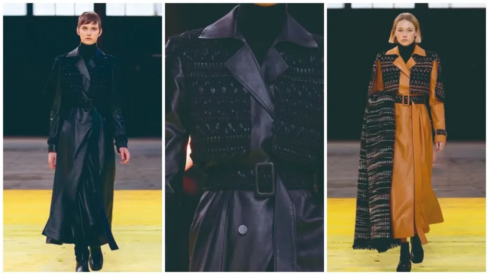 Abrigos de cuero con forma de gabardina con los hombros fuertemente marcados bajo una especie de capa con forma de armadura en seda crepe de China bordada, vestidos de punto y ponchos tejidos en negro y blanco y multicolores con diseños gráficos atrevidos en cashemira reciclada, alpaca, seda y lana sostenible son algunas de las ofertas de esta moda con toques étnicos.