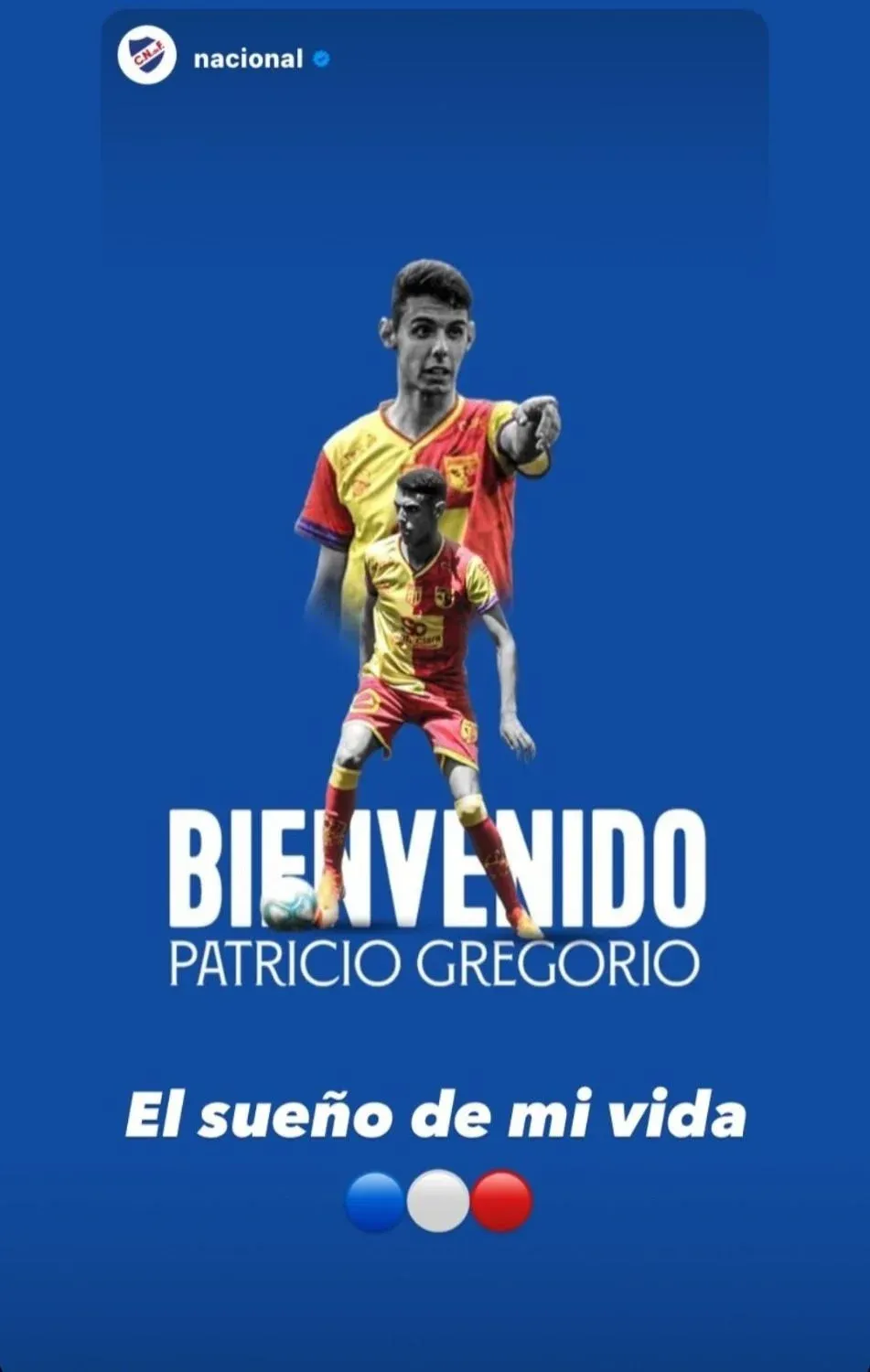 Gregorio, por su parte, compartió la imagen de Nacional en la que anunciaba su llegada al club y comentó: “El sueño de mi vida”. Además, el volante central que llega al club desde Villa Española donde jugó el último campeonato de Segunda división cedido por Danubio, pudo ser visto en fotos personales con la casaca blanca y un camperón tricolor.