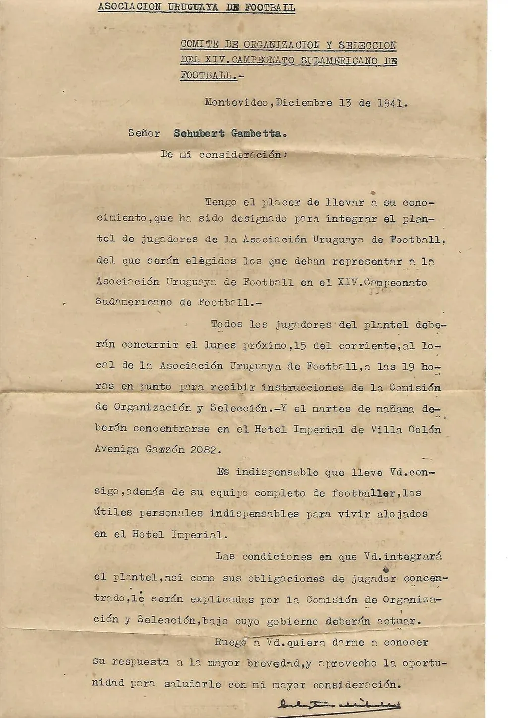 Una joya: la citación de la AUF de diciembre de 1941 hacia Gambetta para que se presente con el plantel que disputaría y ganaría la Copa América de 1942 en Montevideo