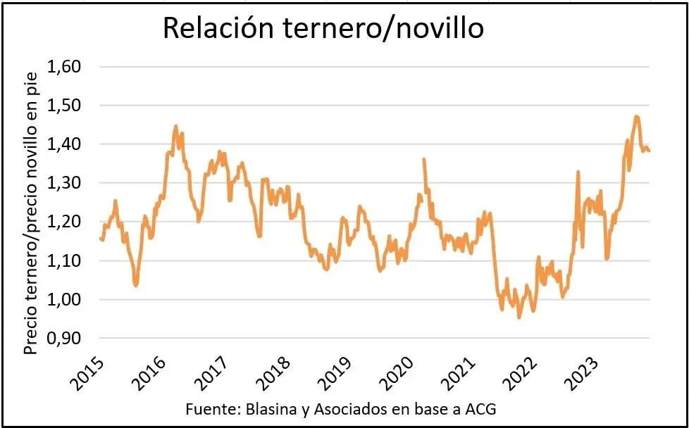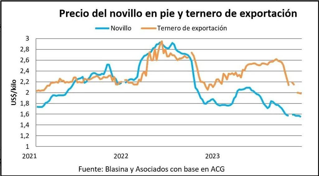 Los terneros enteros para exportación fueron fundamentales para ponerle piso al precio de los ganados de reposición este año. En 2022 cotizaban entre US$ 0,30 y US$ 0,40 por debajo del promedio general de la categoría y este año estuvieron entre US$ 0,10 y US$ 0,20 por encima durante buena parte del año.
