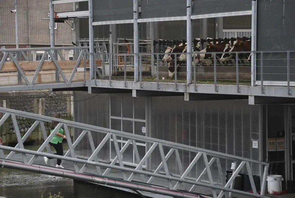 En Holanda, donde la superficie agrícola es escasa y la amenaza del cambio climático es diaria al estar parte del país bajo el nivel del mar, esta plataforma de tres pisos de cristal y acero quiere mostrar el "futuro de la ganadería". Las vacas viven en la planta superior. En la intermedia, la leche se transforma en quesos, yogur y mantequilla. La inferior está destinada a la maduración del queso.