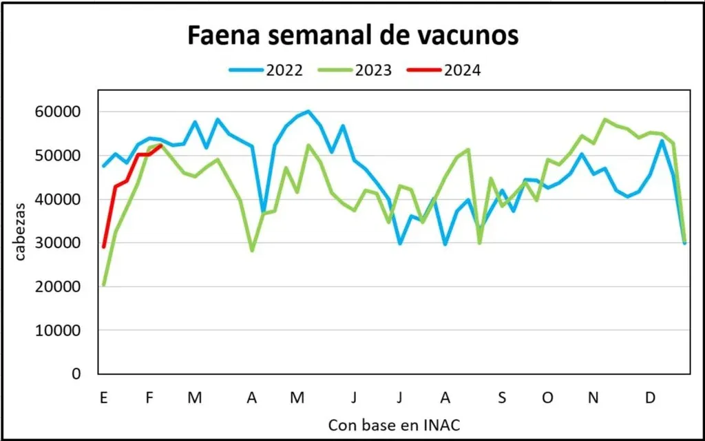 En el mercado de ganado gordo cambia la tendencia de ajuste de las últimas dos semanas y los precios comienzan a trepar; en el pico del ingreso de animales de corral la faena semanal alcanzó la cifra más alta del año con 52.150 cabezas, casi el 52% novillos; y las cifras de la industria y del comercio exterior comenzaron el 2024 al alza.
