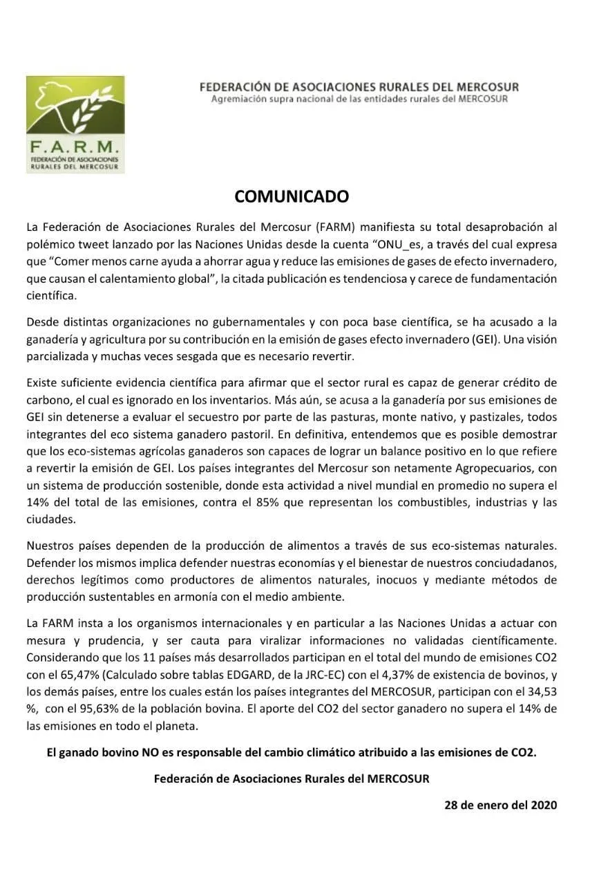 La Federación de Asociaciones Rurales del Mercosur (FARM) manifestó su “total desaprobación” con un tuit enviado por la Organización de las Naciones Unidas (ONU) mediante el cual se promueve bajar el consumo de carnes, dado que entienden que es una publicación “tendenciosa y carece de fundamentación científica”.