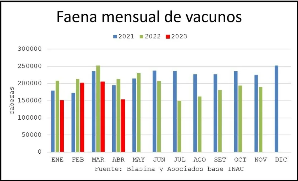 La operativa en frigoríficos la semana pasada creció 27% hasta 47.231 vacunos, casi 10.000 cabezas más que la semana anterior. El mayor incremento fue de novillos. La faena mensual de abril fue la segunda más baja del año, con 152.574 vacunos: 26% menos que un año atrás y apenas por encima de enero, que registró casi 151.000 cabezas.