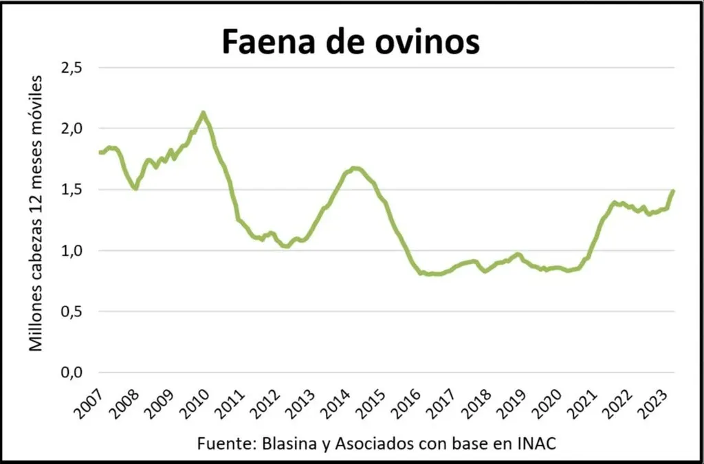 En lo que va de 2023 la faena ovina ha trepado 41%, pasando de estar debajo de las 400.000 cabezas entre enero y abril de 2022 a casi 560.000 en el primer cuatrimestre de este año.