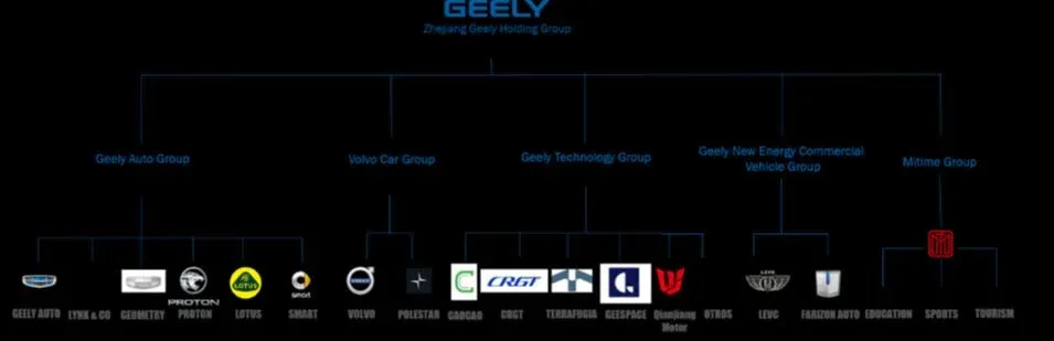 Geely Holding Group comercializa bajo el grupo automovilístico Geely: Geely, Protón, Lotus y Link & Co. (esta es la primera marca desarrollada luego de la fusión de Geely con Volvo).