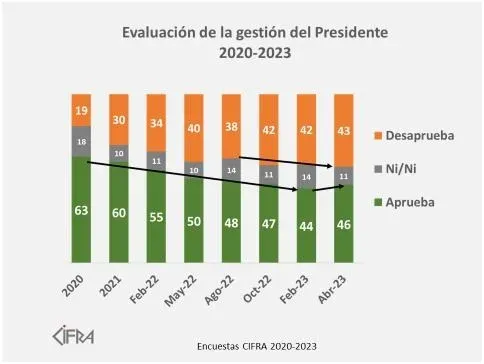 Esta última encuesta muestra un aumento de 2% en la aprobación presidencial dado que en febrero de 2023, un 44% aprobaba la gestión y un 42% la desaprobaba.