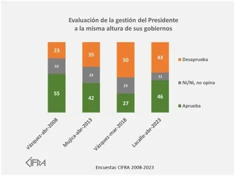 Si se compara la aprobación de Luis Lacalle Pou en el mismo período que el de los últimos gobiernos, Lacalle tiene mejor aprobación a esta altura que el último gobierno de Tabaré Vázquez y que el de José Mujica, aunque en comparación con este, tiene más opiniones negativas.