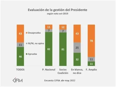 Los porcentajes varían según a qué partido declaran los encuestados haber votado en 2019. Entre los que votaron al Partido Nacional, el 82% la aprueba y el 11% la desaprueba, entre los que votaron a otro partido de la coalición multicolor un 81% la aprueba y un 12% la desaprueba mientras que en el Frente Amplio los porcentajes se invierten. Un 11% la aprueba y un 78% la desaprueba.