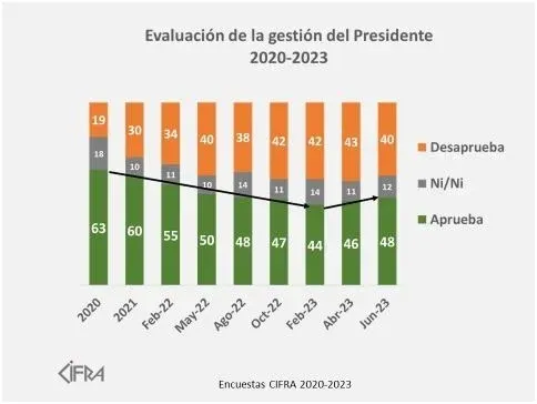 Con respecto a la última encuesta en abril de 2023, la aprobación de la gestión aumentó dos puntos. En abril el 46% aprobaba la gestión y el 43% la desaprobaba. Este es el punto más alto de aprobación de la gestión desde agosto de 2022. A principios de 2023 fue cuando tuvo su momento más bajo, cuando el 44% de los encuestados tenían un juicio positivo sobre la gestión y el 42% un juicio negativo.