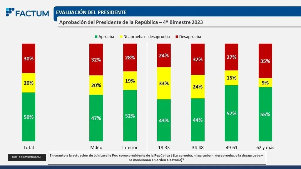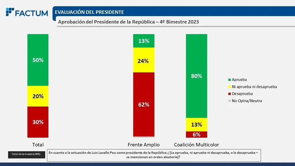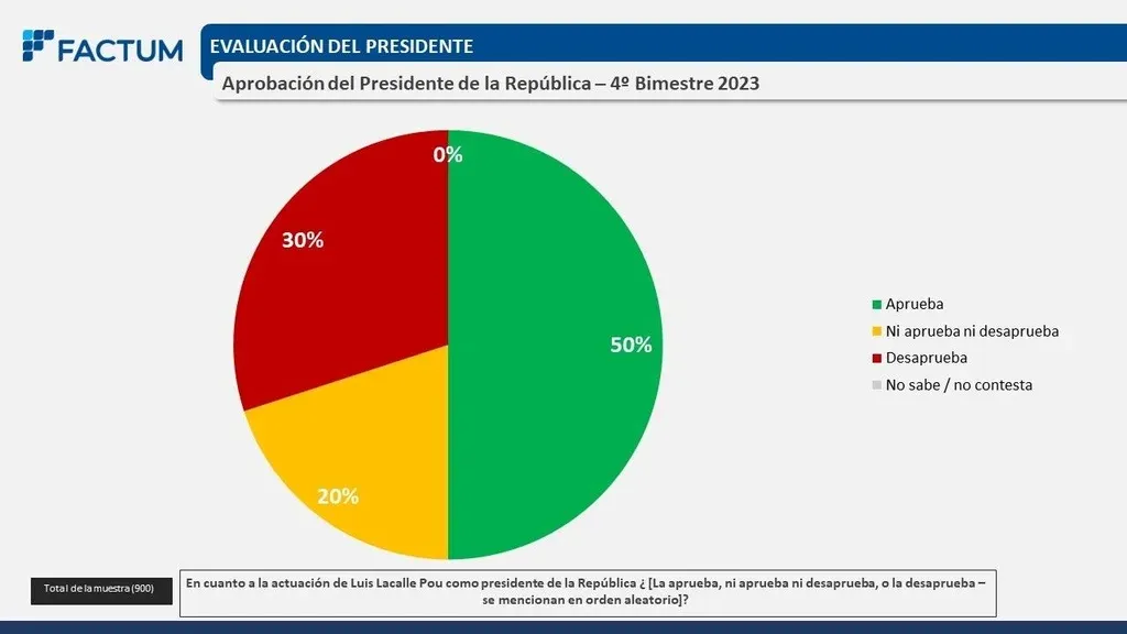 El 50% de los uruguayos aprueba la gestión del presidente de la República Luis Lacalle Pou, mientras que 30% lo desaprueba y un restante 20% ni aprueba ni desaprueba, según el último estudio presentado por la encuestadora Factum este martes en VTV Noticias (VTV).
