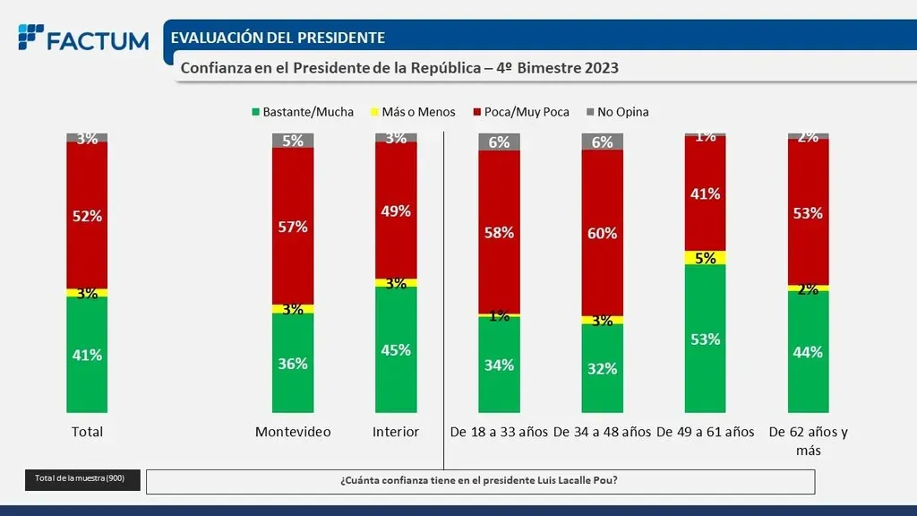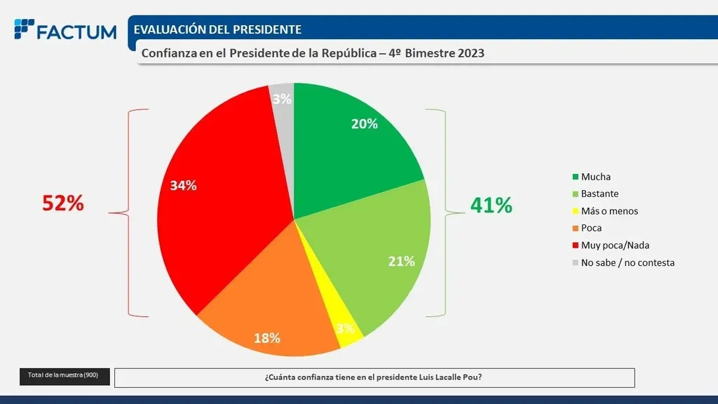 El 41% de los uruguayos siente confianza en Lacalle Pou, mientras que el 52% no siente confianza en el presidente. Un 3% manifestó tener "más o menos" confianza en Lacalle Pou y otro 3% contestó que no sabe o no contestó.