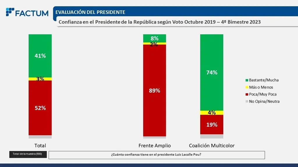 El 74% de los votantes de la coalición oficialista tiene "bastante/mucha" confianza en Lacalle Pou. Mientras que dentro de los votantes del FA el 89% tiene "poca o muy poca" confianza.