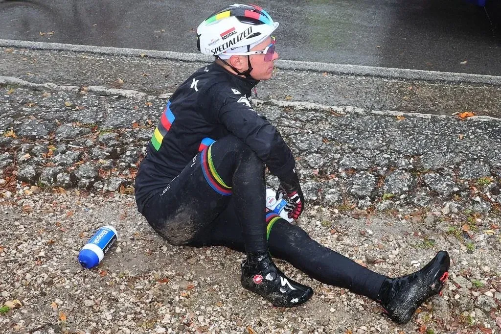 El ciclista belga pudo luego continuar y seguir en la etapa. El asfalto estaba resbaladizo por la lluvia en esa zona, en el paso por un pueblo en el que no había ninguna dificultad, a 150 kilómetros de la meta del día.