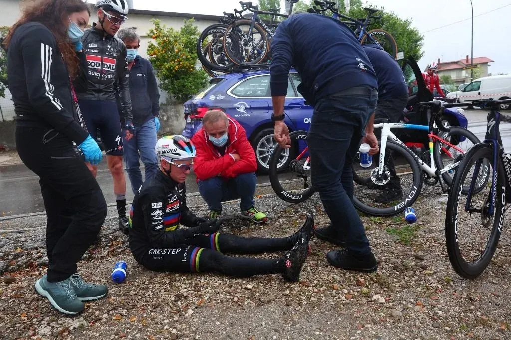 El campeón mundial Remco Evenepoel, favorito al título este año en el Giro de Italia, sufrió este miércoles una caída durante la quinta etapa cuando un perro cruzó la carretera.