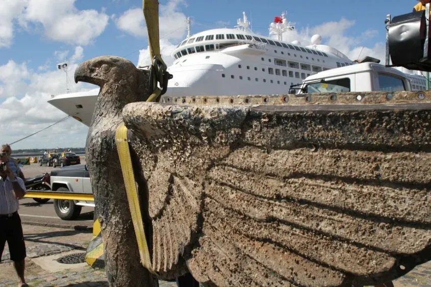 El mundo entero fijó su atención en lo que pasaba en el puerto de Montevideo y la diplomacia del gobierno colorado encabezado por Alfredo Baldomir fue puesta a prueba con la llegada del acorazado y su posterior destrucción a manos de los propios nazis en aguas uruguayas. Lentamente, aquella emblemática nave nazi se hundió en el Río de la Plata, ante los curiosos ojos de los montevideanos. El Graf Spee llevaba un imponente águila de bronce, de dos metros de alto y casi tres de largo y unos 350 kilos de peso. Luego de permanecer 67 años en el fondo del mar, esa pieza cargada de simbolismo por los horrores del nazismo fue extraída el 10 de febrero de 2006.