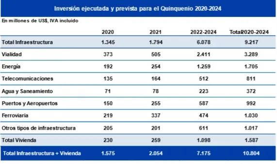 En el período 2022-2024 la inversión destinada a viabilidad se proyectó US$ 2.411 millones, la de energía en US$ 1.259 millones, la de telecomunicaciones en US$ 512 millones,agua y saneamiento US$ 223 millones, otros US$ 587 millones en puertos y aeropuertos, en infraestructura ferroviaria US$ 474 millones, y en otros tipos de infraestructura US$ 611 millones. En el caso de vivienda, la inversión proyectada para el período 2022-2024 se estimó en US$ 1.098 millones.
