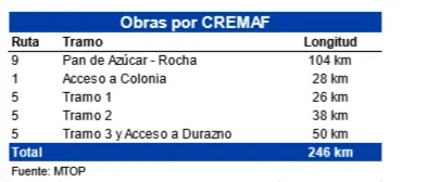 En el caso de las obras en las rutas, la Dirección Nacional de Viabilidad del MTOP ejecutará US$ 202 millones entre 2022-2024 por contrato directo y otros US$ 381 millones a través de contratos PPP. En tanto, a través de la Corporación Vial del Uruguay (CVU) se canalizarán US$ 1.542 millones. El grueso será a través de la malla concesionada (US$ 755 millones) y los contratos Cremaf (US$ 507 millones). Los contratos Cremaf implican, en términos generales, la realización de la obra en dos años y el posterior mantenimiento y el repago en 10 años.