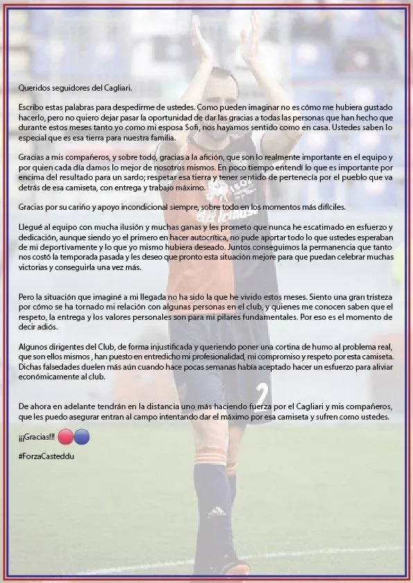 El defensor tuvo palabras de agradecimiento y de disculpas con los hinchas, indicando que se va de la forma en que no le gusta hacerlo. “Siendo yo el primero en hacer autocrítica, no pude aportar todo lo que ustedes esperaban de mí deportivamente y lo que yo hubiera deseado”, reconoció, destacando haber logrado la permanencia en la pasada temporada.