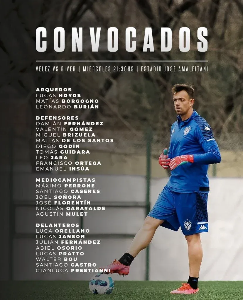 Diego Godín y Leonardo Burián integran la lista de 26 jugadores que convocó Alexander Medina, técnico de Vélez Sarsfield, para el partido de este miércoles a la hora 21:30 frente a River Plate por octavos de final de la Copa Libertadores.