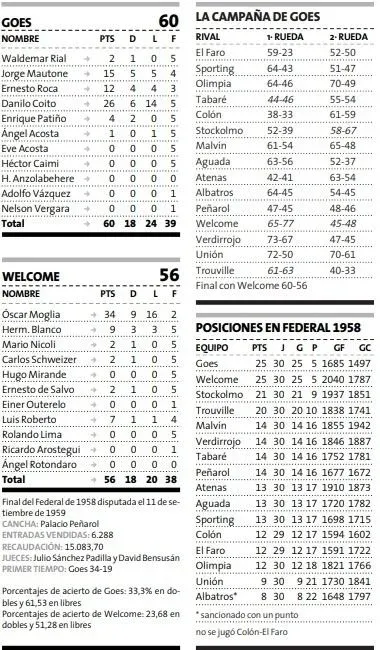 Fue sublime el título que los de Plaza de las Misiones lograron en el Federal de básquetbol de 1958 por lo que implicó ese resultado para los finalistas. Para Goes porque en 1954 había retornado a Primera División tras un corto pasaje por el torneo de ascenso y había amalgamado un equipo equilibrado entre juventud y experiencia, que se transformaría en la última generación ganadora de los azulgranas. Y para Welcome porque la prensa le daba todo el crédito y los espectadores le asignaban el favoritismo debido a la sola presencia de Óscar Moglia, uno de los mejores de la historia, que ya le había otorgado a los albirrojos dos títulos consecutivos (1956, 1957) e iba por el tercero.