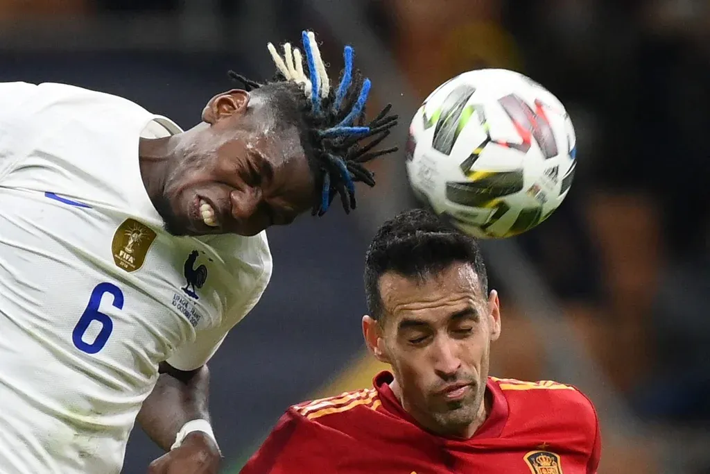 Franck Fife / AFP Paul Pogba y Sergio Busquets Pero de repente combinó con calidad y el larguero de Theo cambió el rumbo del partido y cayeron los goles. Benzema empató con un golazo.