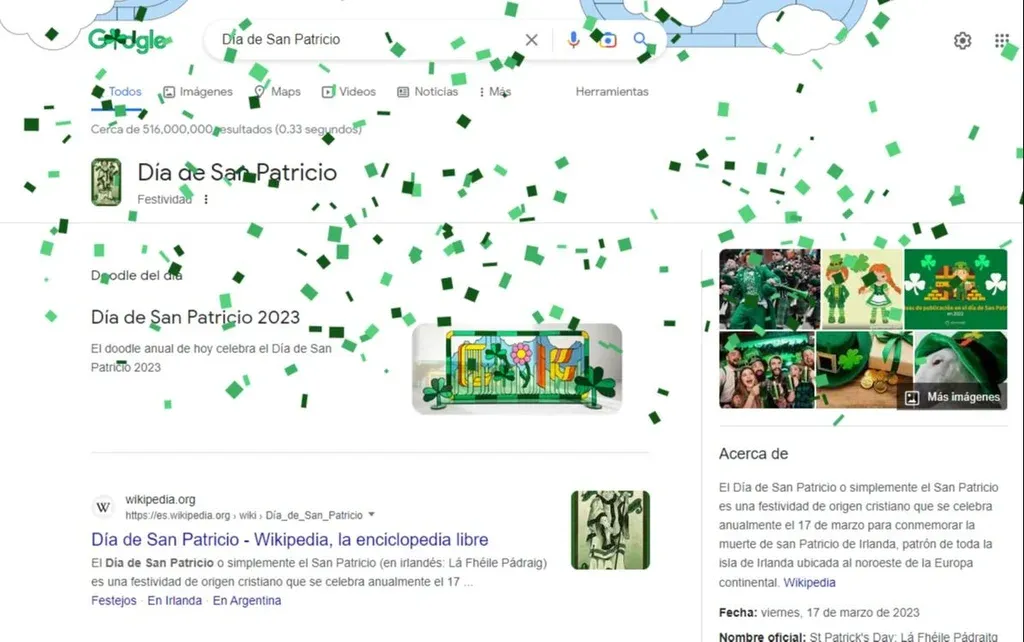 Al cliquear sobre el doodle, Google redirecciona a la búsqueda del "Día de San Patricio", a la que acompaña con confeti verde y un logo de Google verde que cambia una "O" por otro trébol.