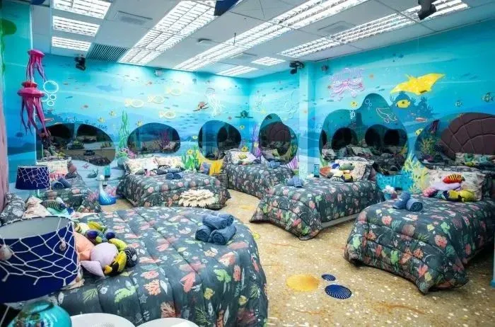 Contrario del estilo "más sobrio" del reality en Argentina, no escatimaron lujos y excentricidades para la competencia del país vecino. Los colores prevalecen y las habitaciones de los participantes están ambientadas como si fuera un "acuario" con peces. Mientras que en la cocina, se destacan las alacenas de un tinte verde esmeralda.