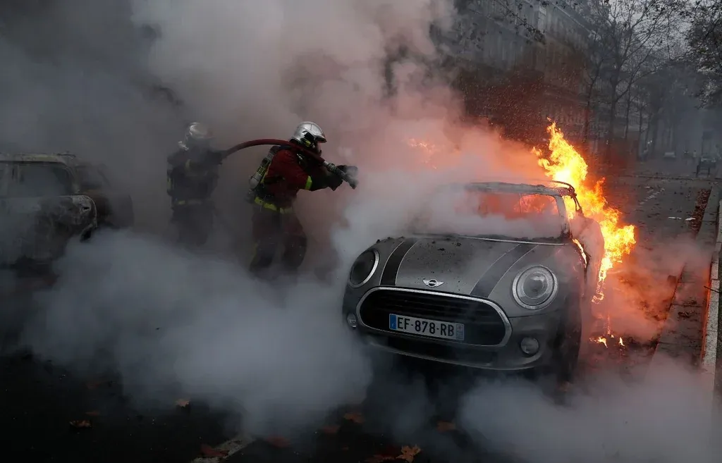 La zona turística de los Campos Elíseos fue presa del caos y el Arco del Triunfo fue pintado con grafitis y asaltado por los alborotadores. En las avenidas adyacentes había barricadas en llamas, algunas formadas con autos volcados e incendiados, y los gases lacrimógenos volaban incesantemente.