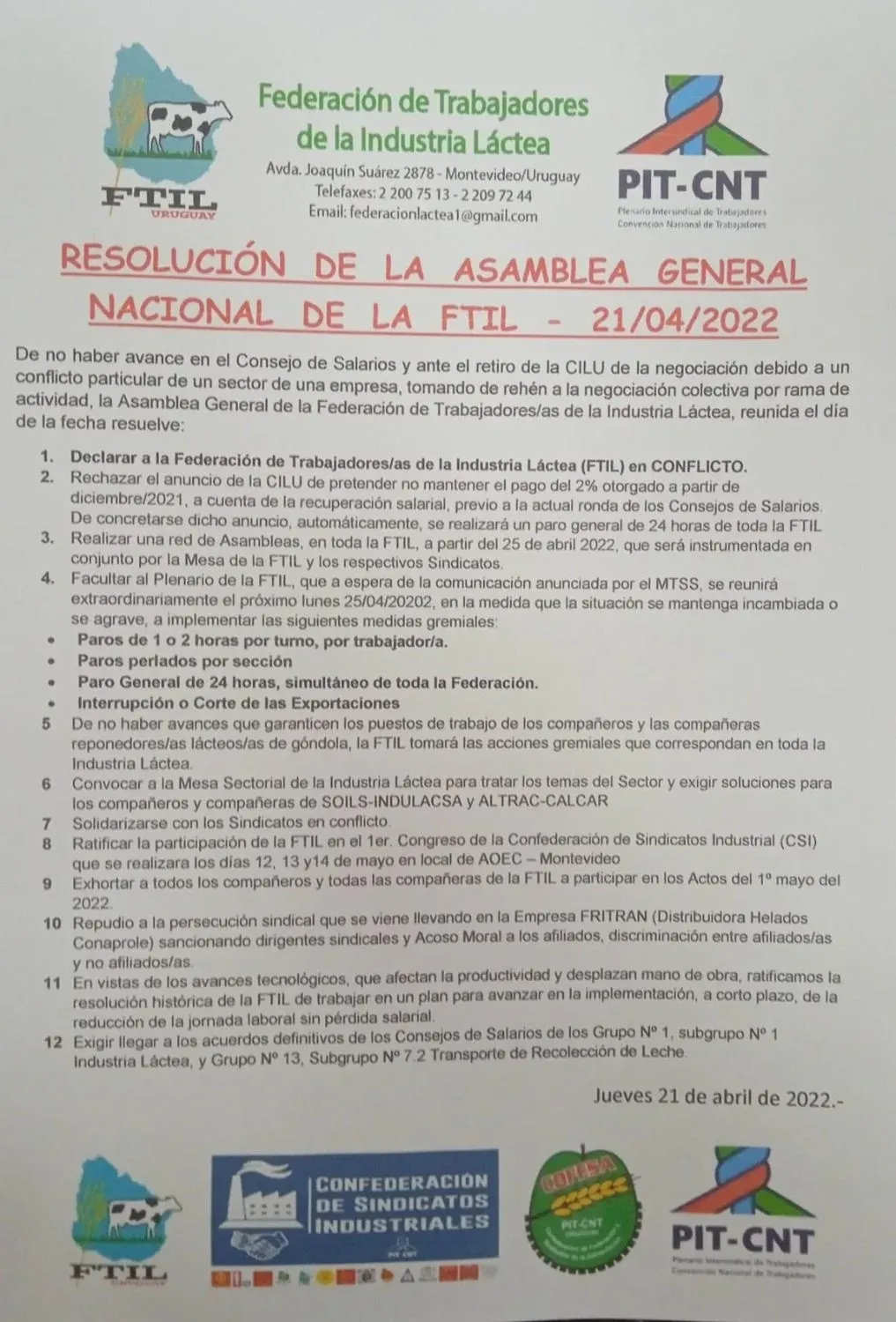 Diego Battiste La reunión se realizó en la sede de la Asociación de Obreros y Empleados de Conaprole (AOEC). A continuación el comunicado de la FTIL con las medidas planteadas:
