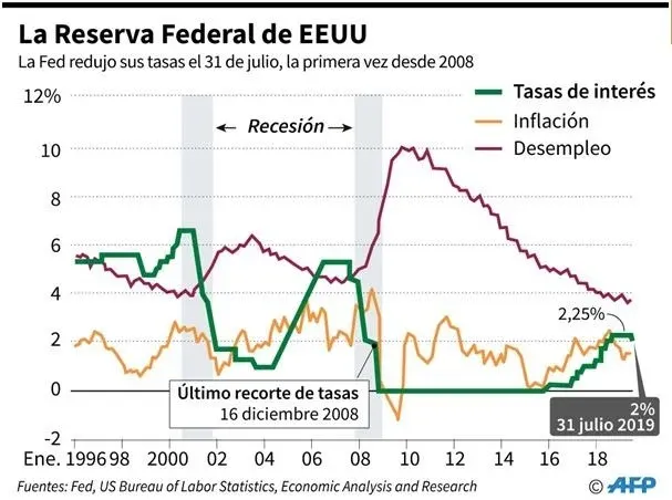 De hecho, la decisión de la Reserva Federal de Estados Unidos de reducir las tasas de interés por primera vez en 11 años debería contribuir a un debilitamiento del dólar frente a otras monedas, pero la evolución en los últimos días fue la opuesta debido a que el enfrentamiento con China lleva a los inversores a posicionarse en activos más seguros, y el dólar es uno de ellos.