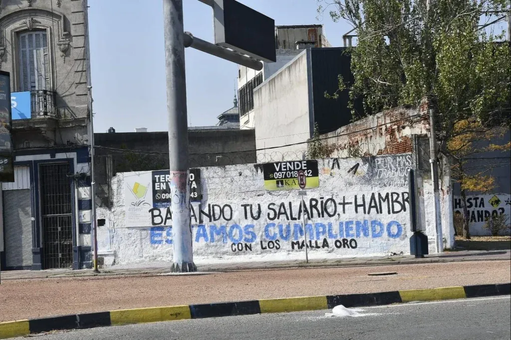 "Bajando tu salario + hambre estamos cumpliendo con los malla oro", se lee en un mural