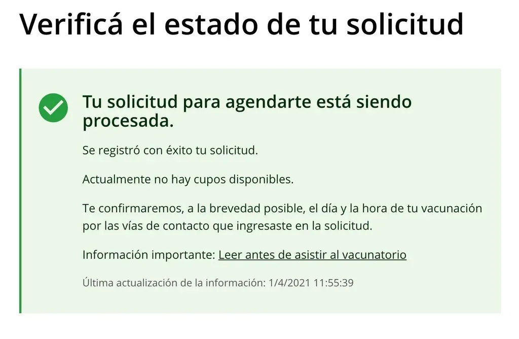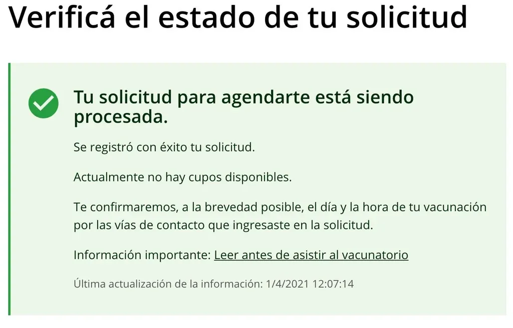En los dos casos, el registro fue realizado con éxito, según aparece en el sitio web del MSP cuando se consulta por su cédula de identidad. Sin embargo, por el momento no han recibido confirmación de fecha y hora para recibir la primera dosis de la vacuna.