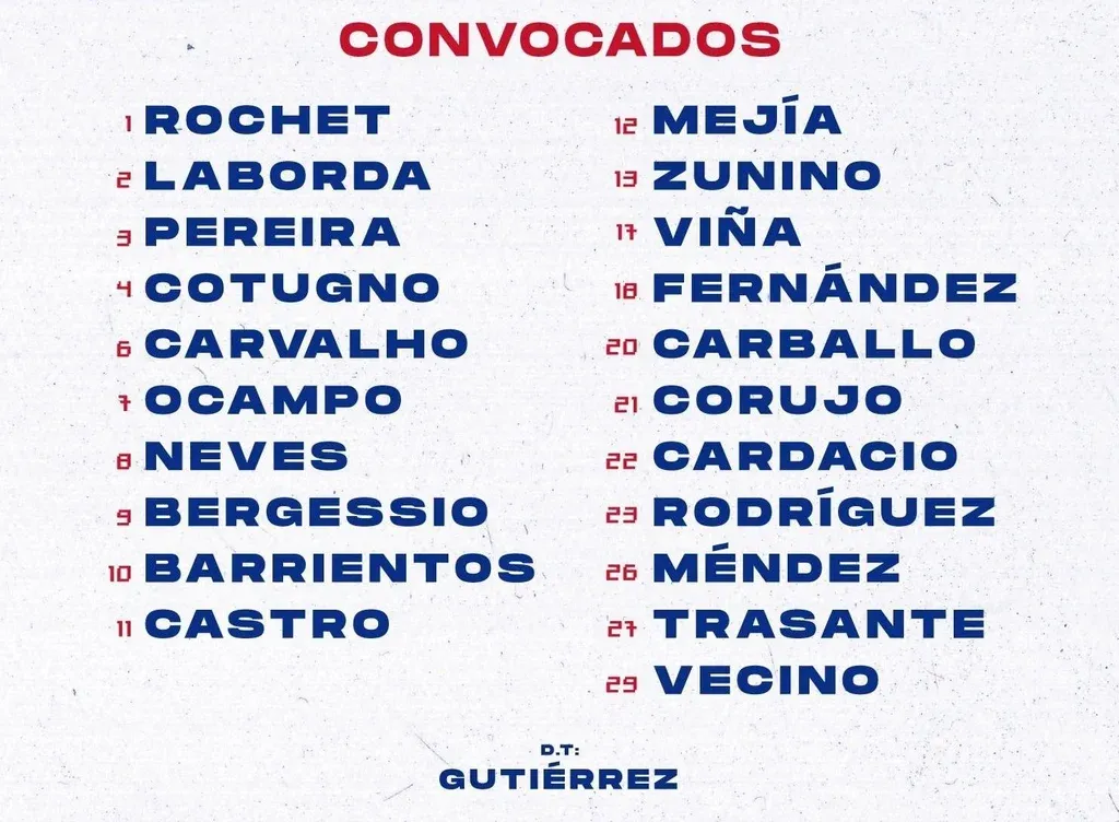 Así como pasó para el partido anterior, en la lista se encuentran Felipe Carvalho y Gabriel Neves, quienes se recuperan de lesiones y no es segura la participación en este partido.