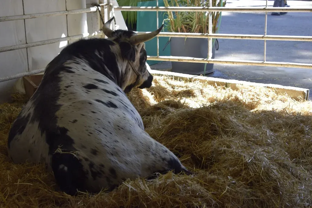 La vaca Guyunusa y el toro Tacuabé descansan en sus camas mientras el segundo día de la Expo Prado 2022 se desarrolla. El de la Rural del Prado no es el ambiente rochense al que están acostumbrado, en donde se destacan por andar entre las palmeras, pero los dos ejemplares se han adaptado bien al ambiente montevideano, esa es una de sus principales características: el ganado Criollo se adapta bien a los diferentes escenarios.