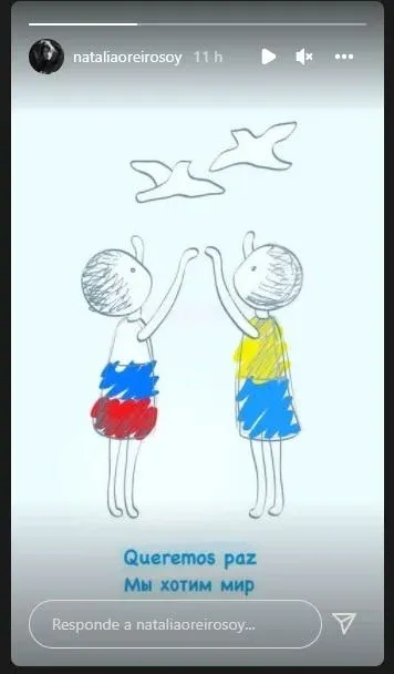 En una historia en la que se puede ver una ilustración de dos niños vestidos con colores de Rusia y Ucrania, elevando los brazos hacia dos palomas blancas, Oreiro escribió "queremos paz". Además, tradujo el mensaje también al ruso.