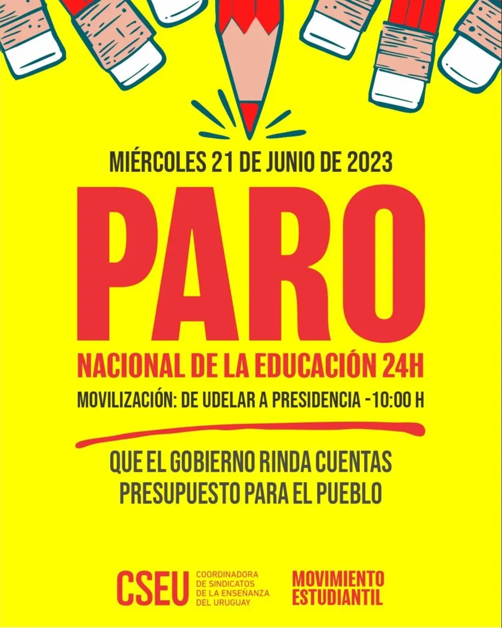 Los sindicatos de la educación de todo el país harán un paro el próximo miércoles 21 de junio. Se movilizarán desde la explanada de la Udelar hasta Presidencia a partir de las 10 de la mañana.