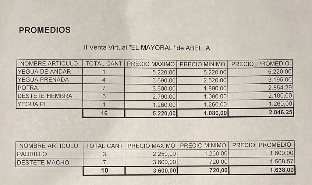 En el caso de la venta de Cuarto de Milla de El Mayoral culminó con ventas totales y un promedio de US$ 2.846 para las 16 hembras vendidas, entre las que había yeguas de andar, preñadas, potras, destete y yeguas de pedigrí; y de US$ 1.638 para los machos, que fueron 10 en total entre padrillos y destete.