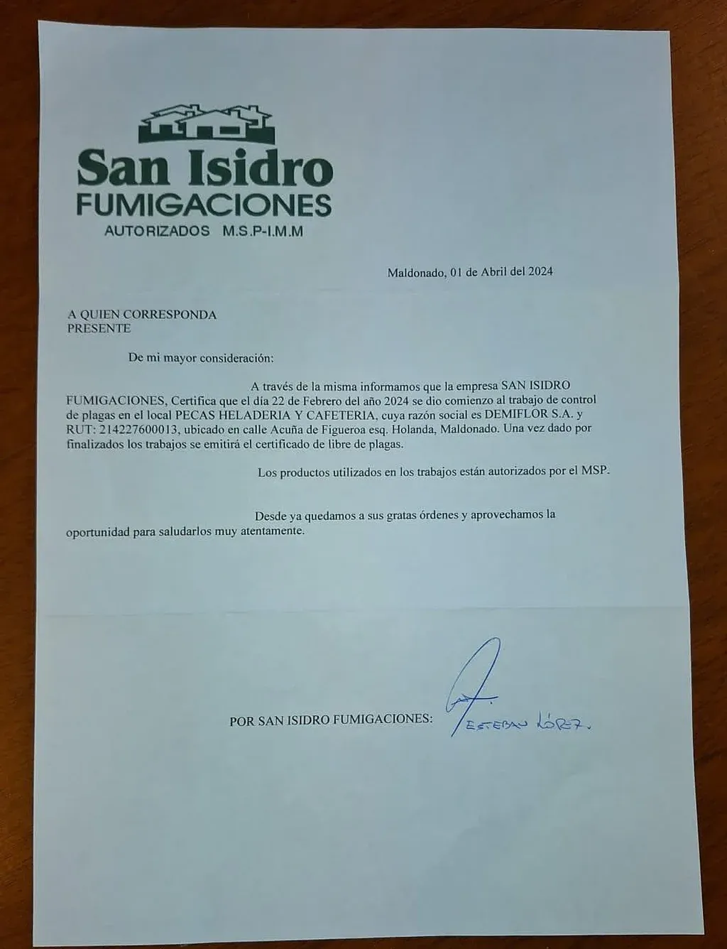Documento de de la Dirección de Higiene y Bromatología de la Intendencia de Maldonado Además, divulgó un documento de una empresa de fumigación que certifica que desde el 23 de febrero comenzaron con el trabajo de control de plagas. Posterior a esto, el propietario dijo que no brindaría declaraciones sobre el tema al menos hasta que ambas partes se presenten en el Ministerio de Trabajo en Maldonado el 18 de abril para tratar el hecho.