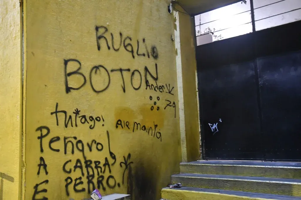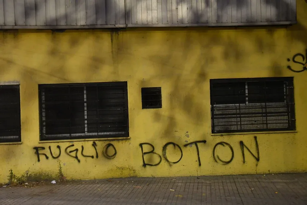 En tres puntos distintos de los muros externos del Palacio, los hinchas graffitearon la leyenda "Ruglio botón", insultando a su presidente.