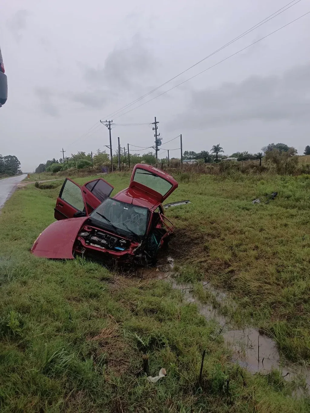 Según informó Policía Caminera, el camión con zorra (vacío) circulaba de sur a norte y el auto, que circula por misma ruta en sentido contrario, impactó en la rueda delantera izquierda del camión, quedando el auto sobre cuneta oeste y camión pierde el dominio y queda en faja natural oeste.