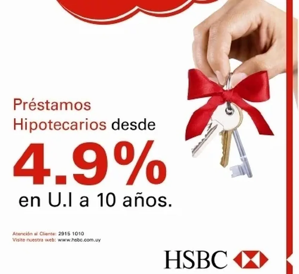 En cualquiera de las sucursales HSBC en el país, se podrá acceder a préstamos hipotecarios con tasas desde 4,9% en Unidades Indexadas, en un plazo de hasta 10 años. “Llave en mano” permitirá financiar hasta el 85% del valor de tasación del inmueble deseado.