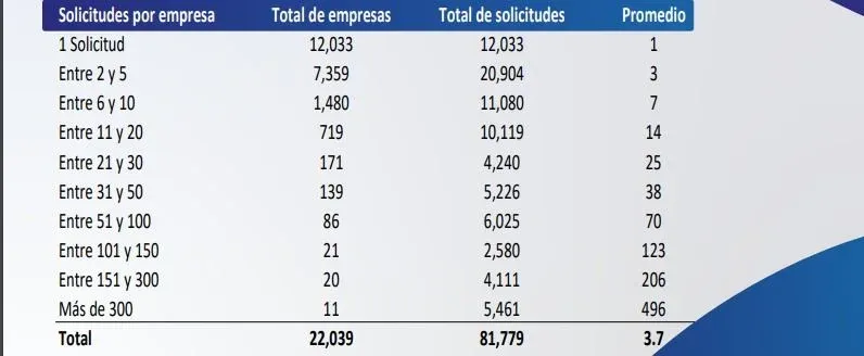Del total de empresas, 12.033 registraron solo una solicitud de la prestación social, más de 7 mil pidieron entre 2 y 5, mientras que hubo 20 empresas que enviaron entre 150 y 300 trabajadores al seguro de paro. Estas últimas promediaron 206 solicitudes de subsidio por desempleo el pasado mes.