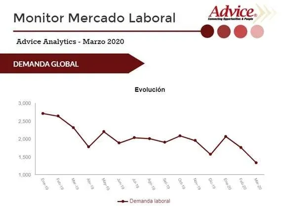 Según el informe, en marzo la demanda laboral disminuyó un 24% con respecto al mes anterior. Desde una perspectiva interanual la disminución fue aún mayor, con una caída del 43%. Esto se traduce en una diferencia de alrededor de 1.000 oportunidades laborales menos, si se compara marzo de 2020 con mismo mes de 2019, según los principales portales laborales relevados por Advice.